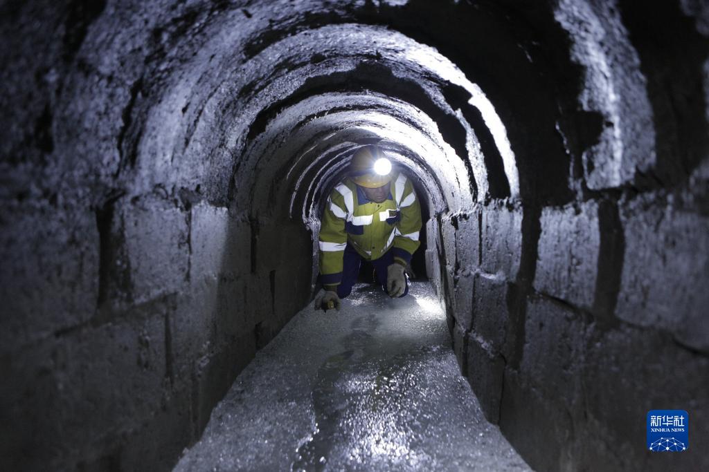 9月13日,在大興安嶺地區(qū)白卡爾隧道,中國鐵路哈爾濱局集團有限公司加格達奇工務(wù)段的鐵路工人在地下8米的深井檢查排水系統(tǒng)的暢通情況。