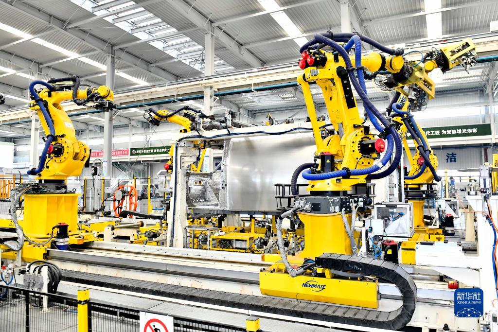 9月13日,在山東鄒平魏橋輕量化基地宏奧全鋁車身集成生產車間,工業機器人在流水線上作業。