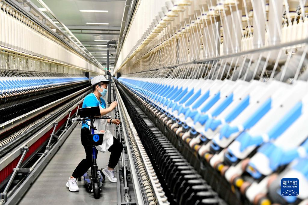9月13日,在山東宏儒紡織科技有限公司綠色智能化生產車間,工作人員在加工高端紗線。