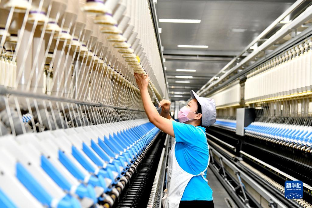 9月13日,在山東宏儒紡織科技有限公司綠色智能化生產(chǎn)車間,工作人員在加工高端紗線。