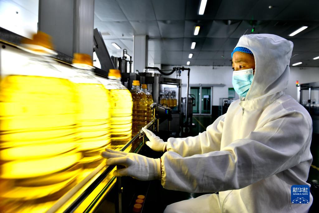 9月13日,在長壽花食品股份有限公司玉米油生產線,工作人員在流水線上作業。