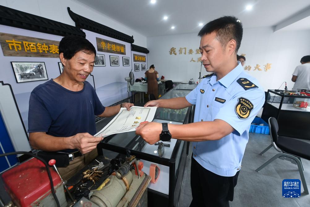 9月14日,在龍泉街道的社區(qū)服務(wù)便民小店內(nèi),市場(chǎng)監(jiān)管部門工作人員把集中登記、代辦好的營(yíng)業(yè)執(zhí)照交給商戶黃賢德(左)。新華社記者 徐昱 攝