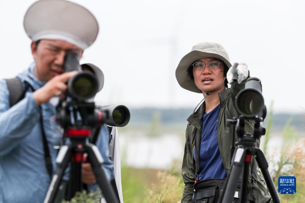 賈亦飛(左)、楊洪燕(右)在野外考察鳥類(2023年8月19日攝)。新華社記者 楊磊 攝