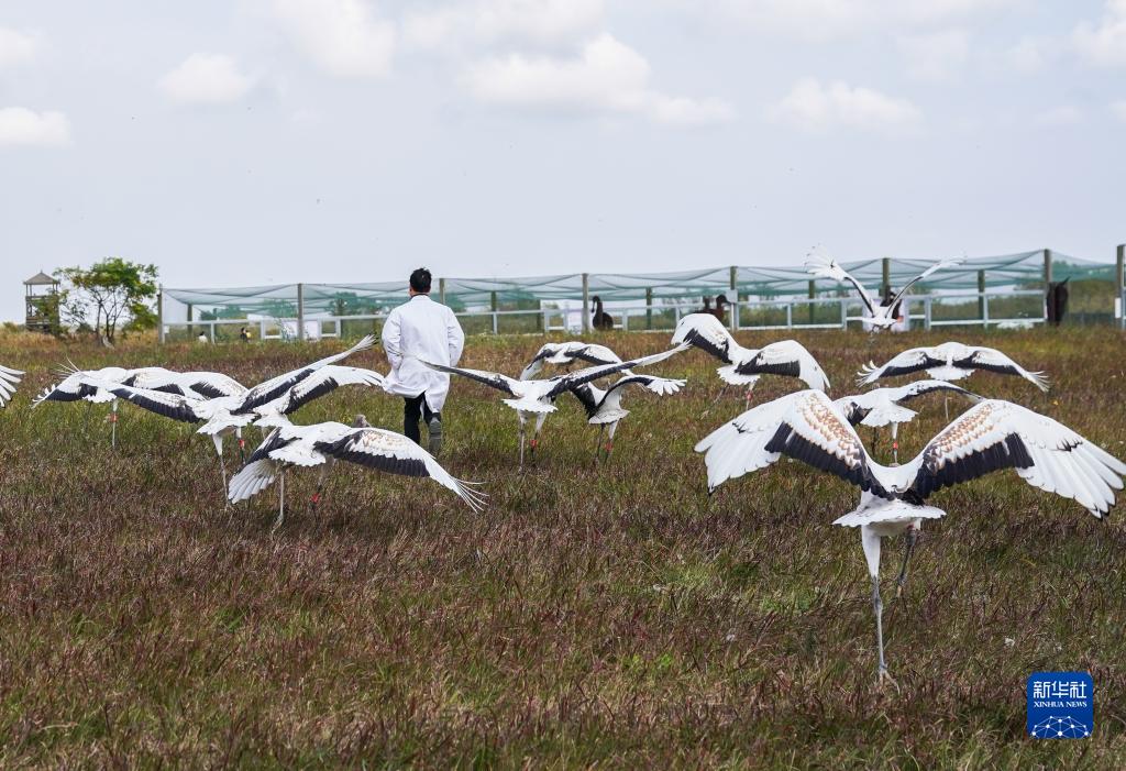 姜官宏對人工繁育的丹頂鶴進(jìn)行野外放飛訓(xùn)練(2022年11月8日攝)。新華社記者 季春鵬 攝