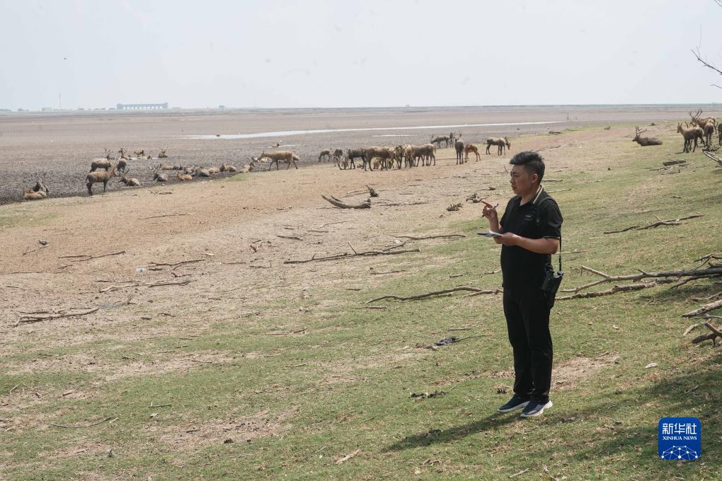 劉彬在保護區記錄麋鹿種群數量(2023年8月21日攝)。新華社記者 季春鵬 攝