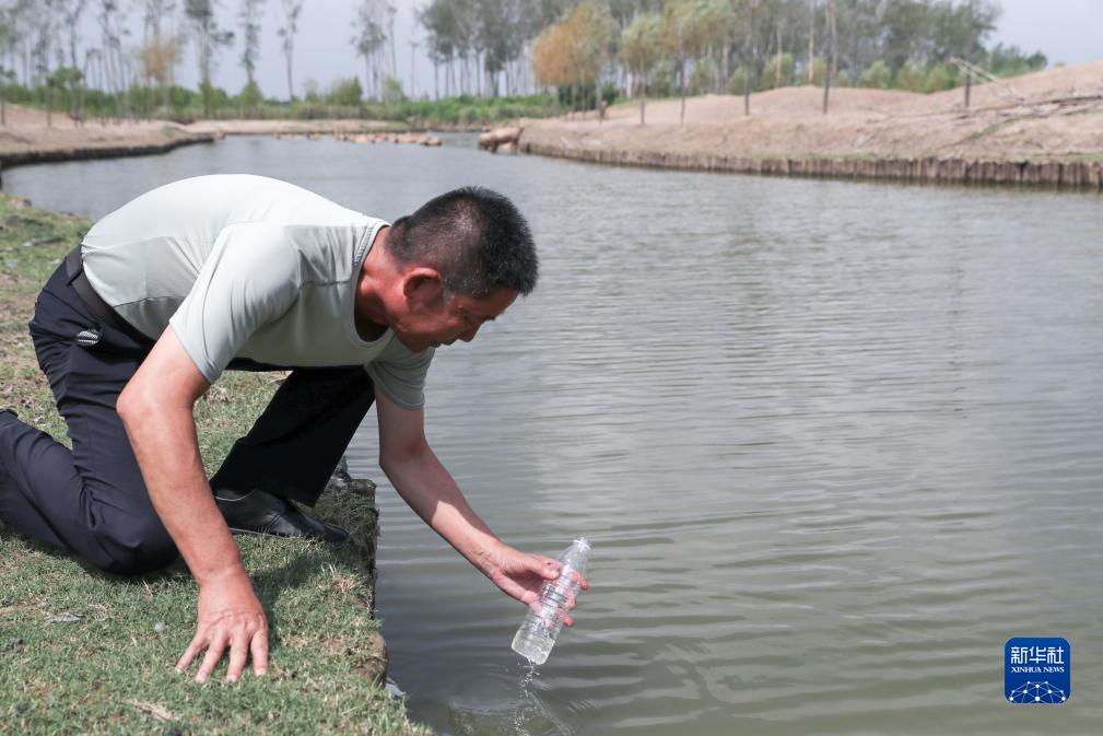 徐安宏在麋鹿活動區域采集水樣(2023年8月21日攝)。新華社記者 楊磊 攝