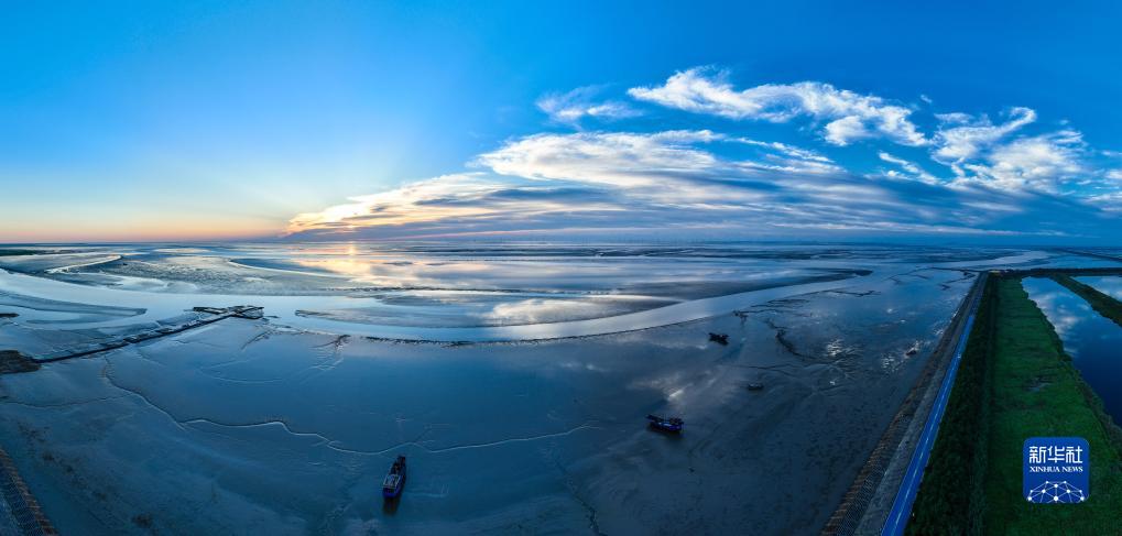 東臺條子泥濕地日出時分(2023年9月1日攝,無人機(jī)照片)。新華社記者 季春鵬 攝