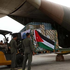 9月13日,工作人員在約旦安曼一軍用機場搬運援助物資。