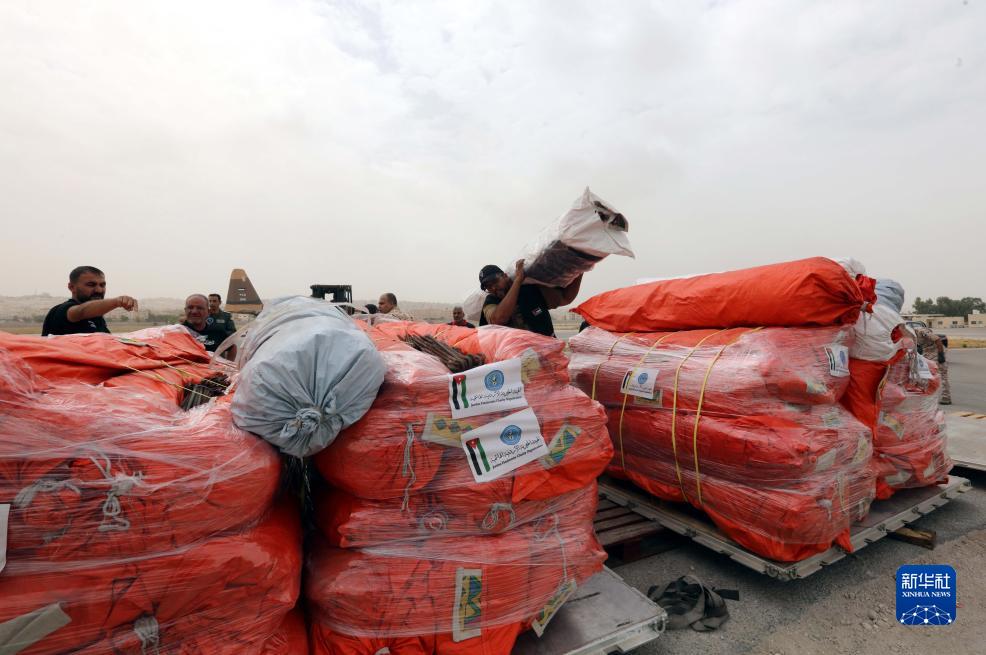9月13日,工作人員在約旦安曼一軍用機場搬運援助物資。