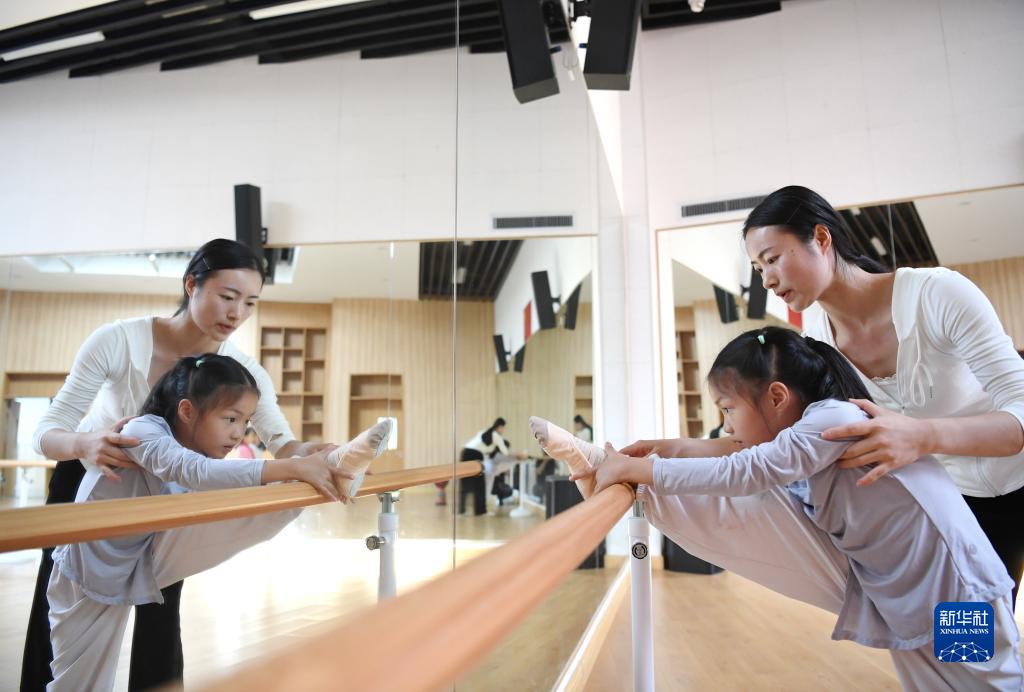 9月13日,雄安史家胡同小學舞蹈老師指導學生拉伸。