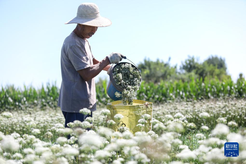 9月14日,農(nóng)民在山東省淄博市高青縣青城鎮(zhèn)田間采摘韭花。