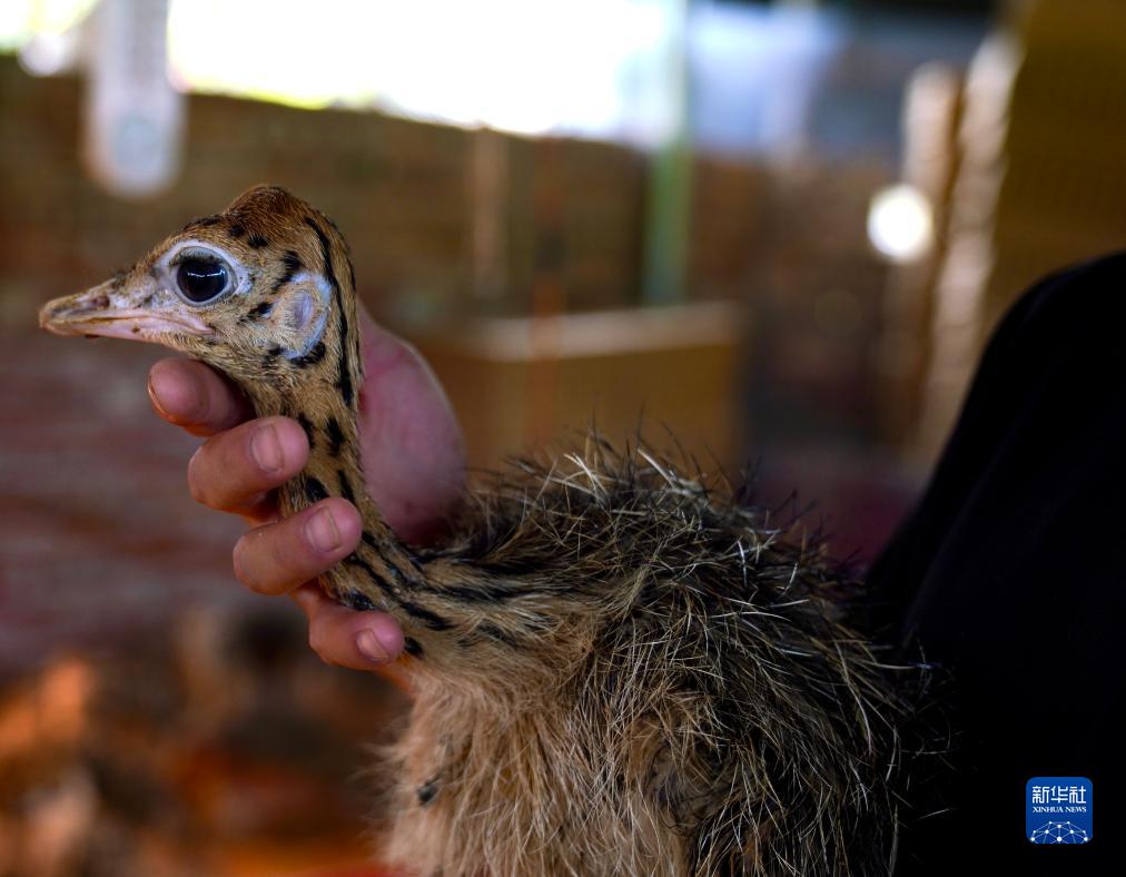 9月13日,吳錦彪安撫一只鴕鳥幼崽。新華社記者 胡晨歡 攝