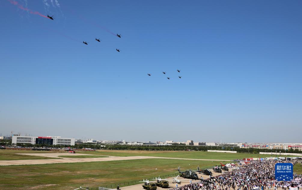 9月14日,在第六屆中國天津國際直升機博覽會開幕式上,陸軍“風雷”飛行表演隊進行通場飛行表演。