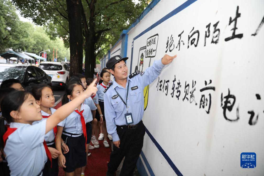 9月14日,浙江省東陽市公安局江北派出所的輔警向江北二小的學生講解網絡安全知識。