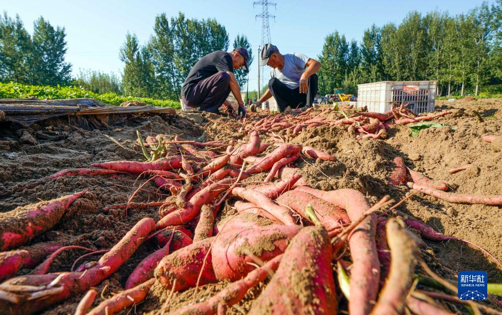 9月14日,河北省唐山市海港經濟開發區王灘鎮農民在田間收獲紅薯。