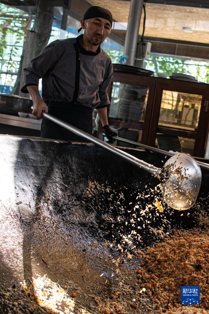 9月13日,在烏茲別克斯坦首都塔什干,中亞抓飯中心主廚制作抓飯。