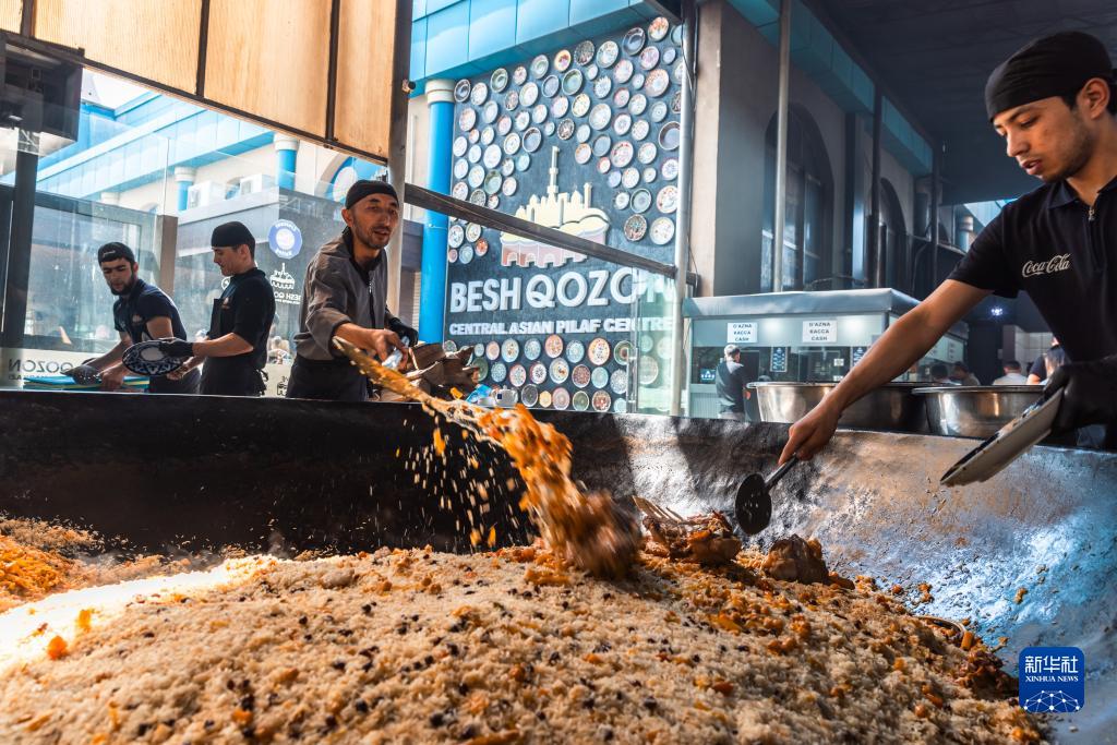 9月14日,在烏茲別克斯坦首都塔什干,中亞抓飯中心主廚(左三)制作抓飯。