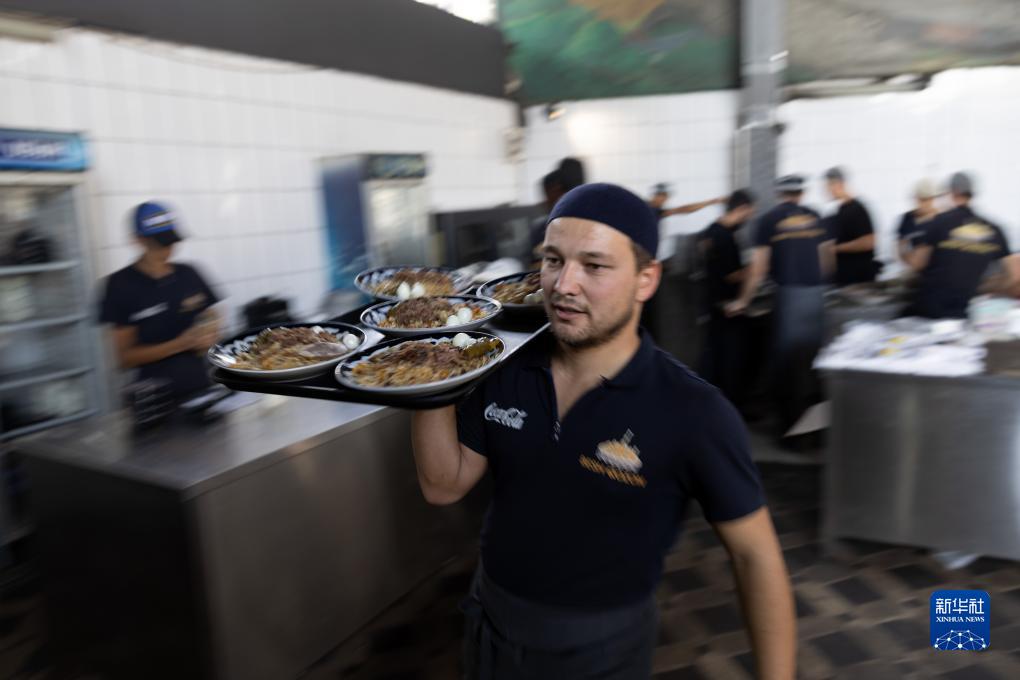 9月13日,在烏茲別克斯坦首都塔什干,工作人員運送抓飯。
