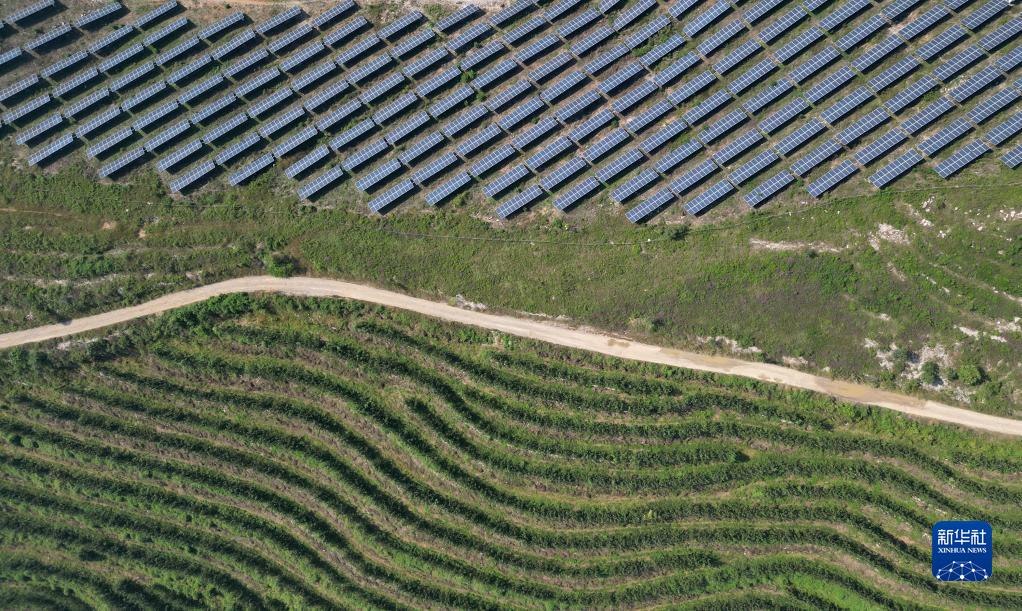 這是河北省玉田縣唐自頭鎮一處經荒山開發而建的果園和光伏發電場(9月15日攝,無人機照片)。