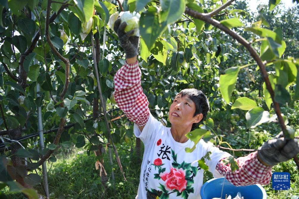 9月15日,農民在河北省玉田縣唐自頭鎮一處經荒山開發而建的果園內采摘鮮梨。