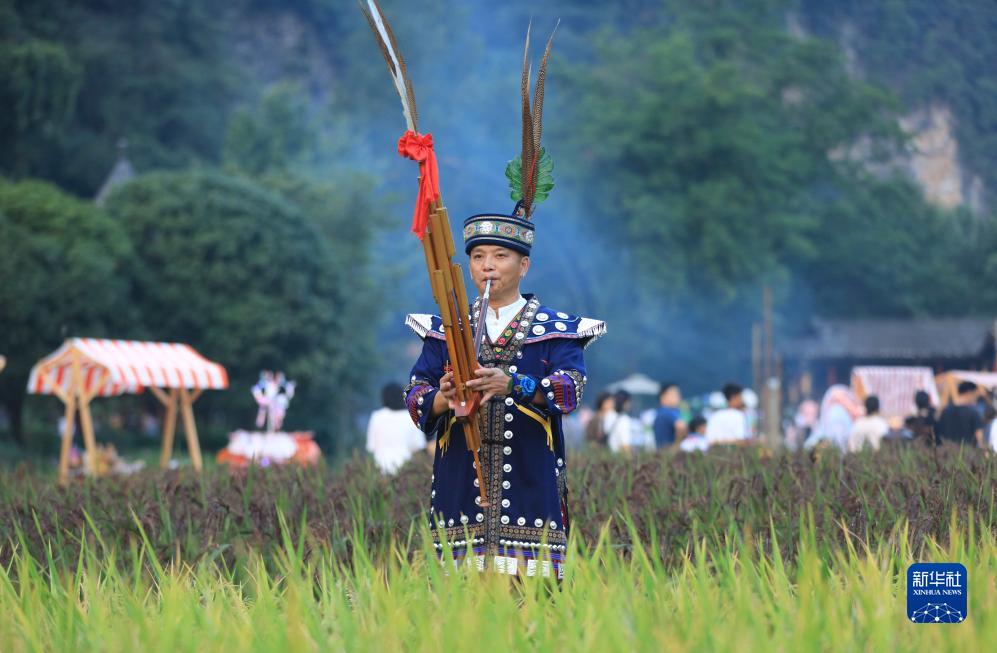 9月15日,民間藝人在張家界市武陵源區(qū)黃龍洞景區(qū)“田園市集慶秋收”活動現(xiàn)場表演。