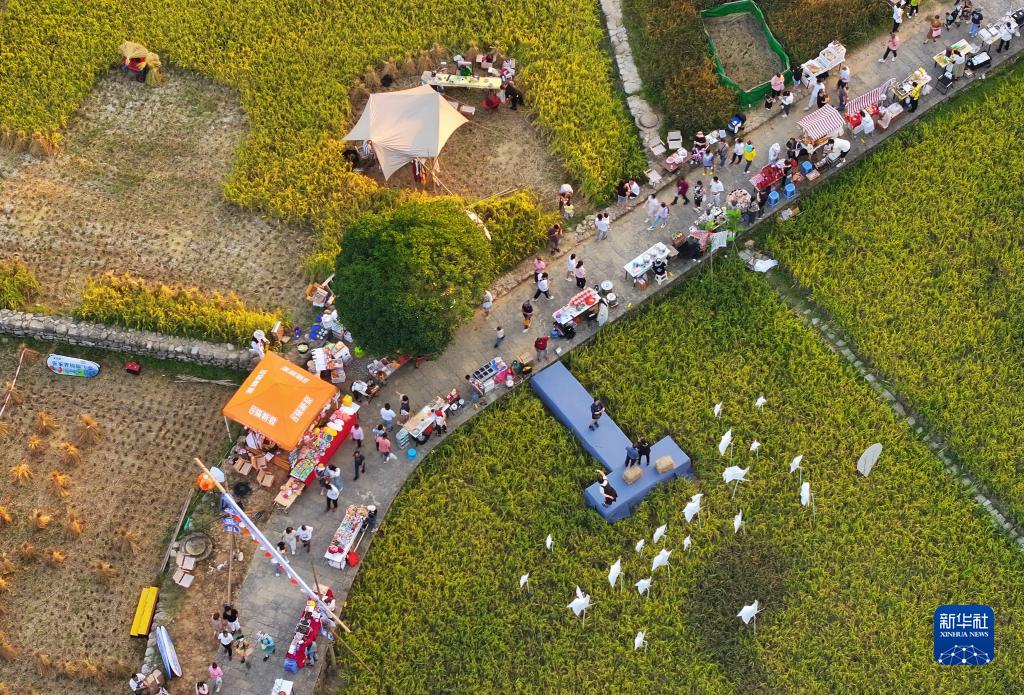 當(dāng)日,湖南省張家界市武陵源區(qū)黃龍洞景區(qū)舉辦“田園市集慶秋收”活動(dòng)。金黃的稻田旁,游人可欣賞民俗文化節(jié)目,還可品嘗特色小吃、購買當(dāng)?shù)靥厣r(nóng)產(chǎn)品和手工藝品,感受豐收的喜悅。