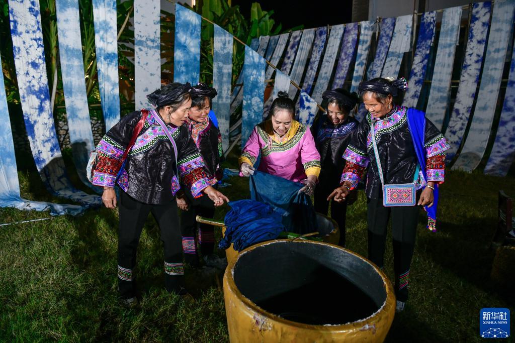 9月14日,村民在興義市萬峰林街道的“鄉愁集市”展示染布技藝。