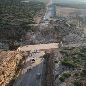 這是9月15日在利比亞東部德爾納附近拍攝的被毀的橋梁(航拍照片)。