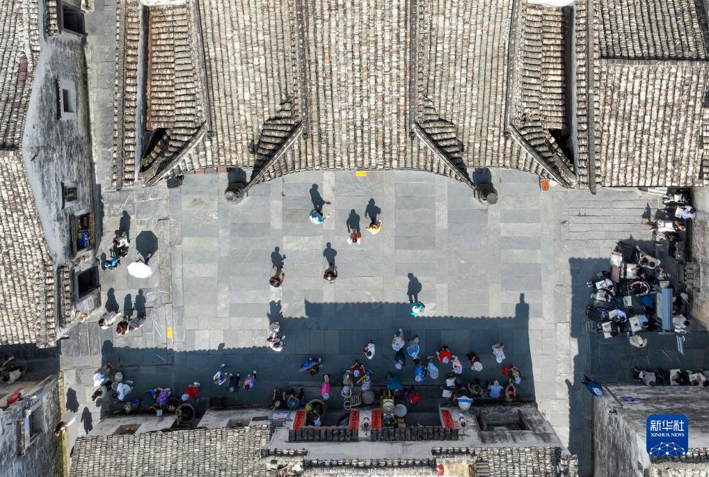 游客們在黃山市黟縣西遞古村內游覽(9月7日攝)。