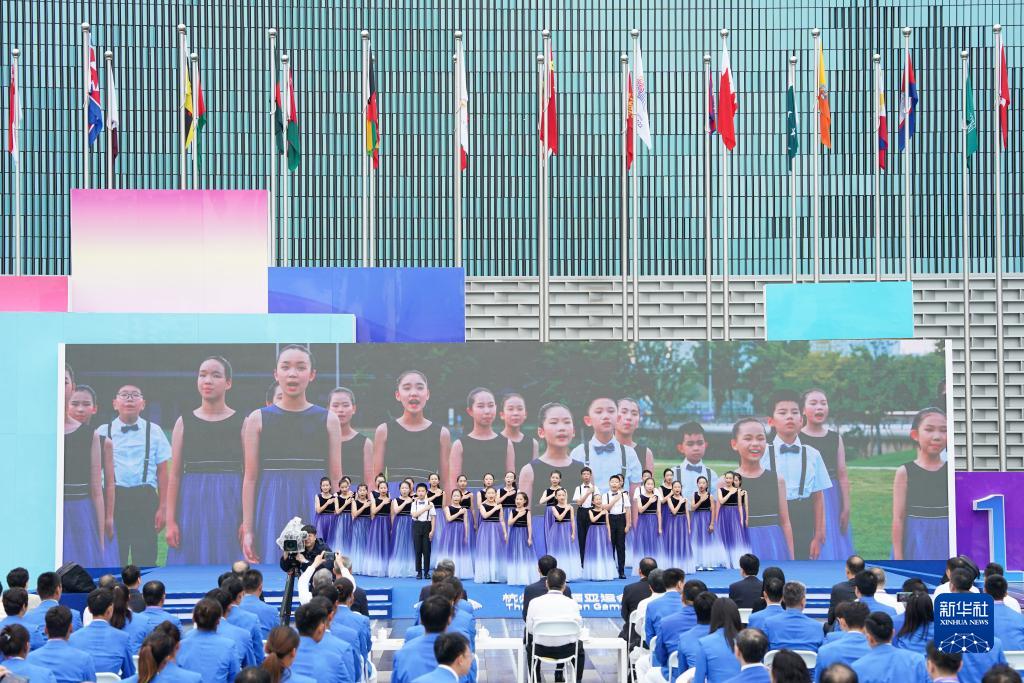 9月16日,小演員們在儀式上合唱杭州亞運會主題歌曲《同愛同在》。