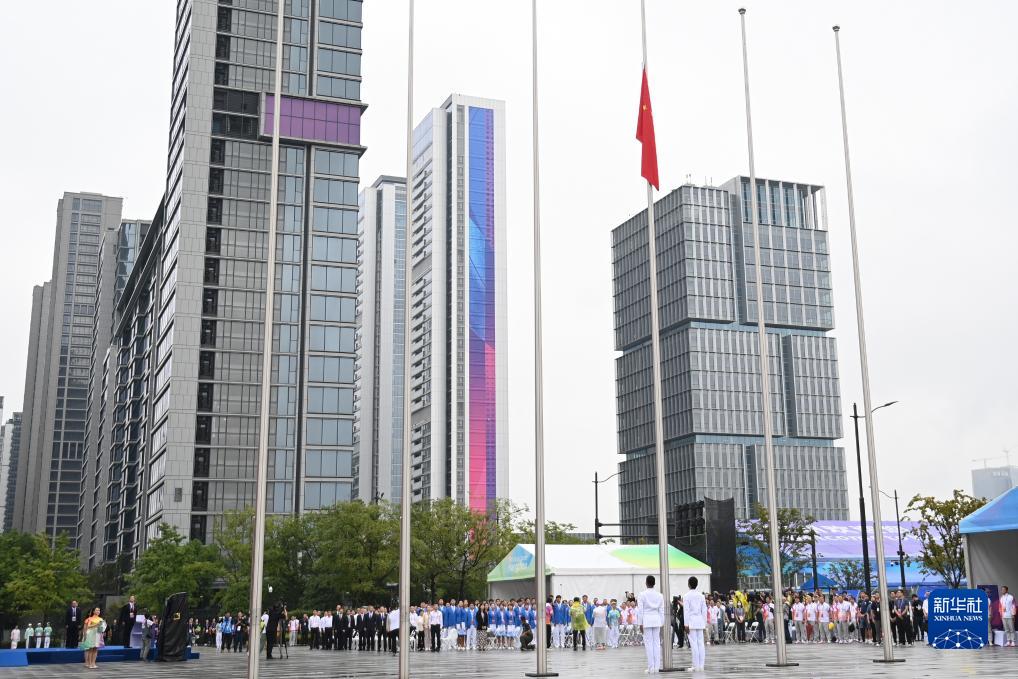 當日,杭州亞運會亞運村開村儀式暨中國體育代表團歡迎儀式在亞運村旗幟廣場舉行。
