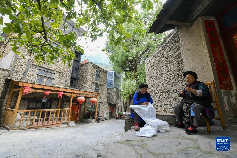 9月13日,羌族阿媽在自家房屋前做針線活。