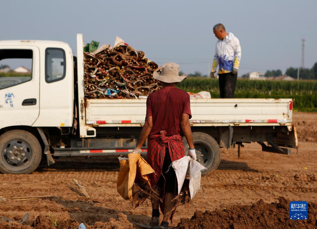 9月15日,河南省焦作市溫縣黃莊鎮米莊村農民在田間搬運剛收獲的鐵棍山藥。