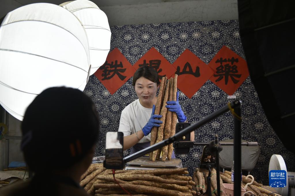 9月15日,河南省焦作市溫縣黃莊鎮東林肇村農民主播通過網絡直播銷售鐵棍山藥。