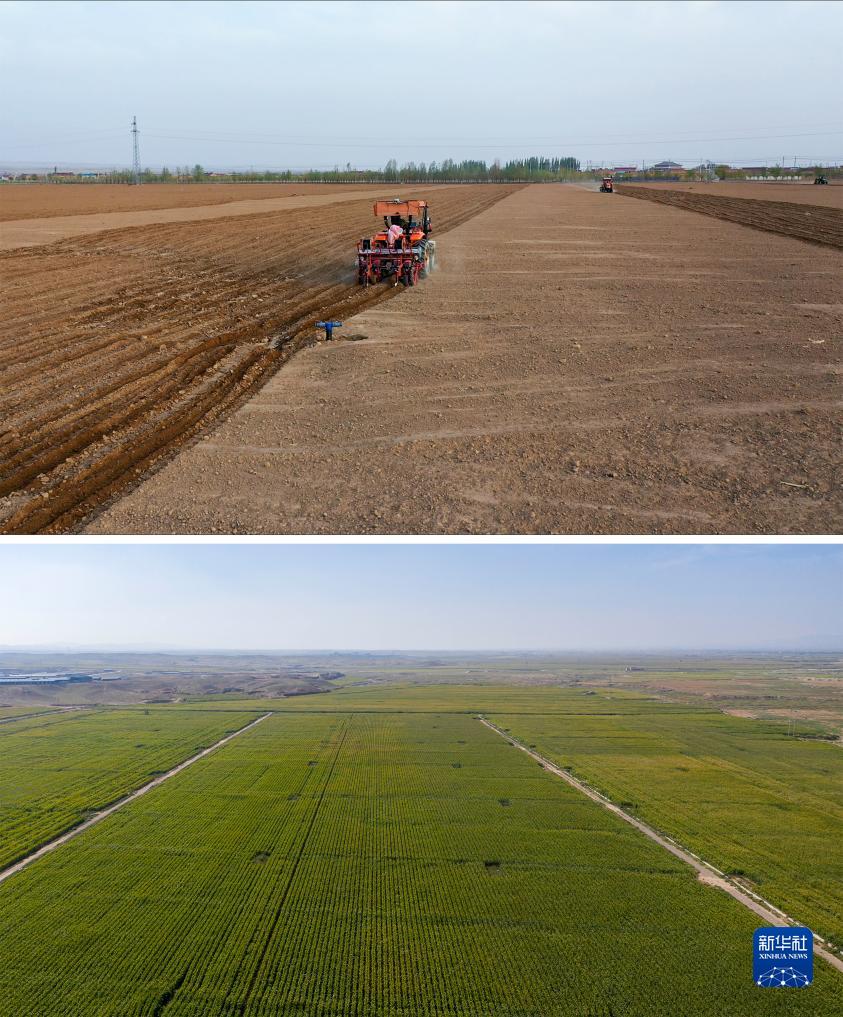 這是一張拼版照片,上圖是農民在寧夏吳忠市同心縣韋州鎮鋪設滴灌帶(資料圖片,2023年4月20日攝);下圖是9月14日拍攝的位于寧夏吳忠市同心縣韋州鎮現代高效節水灌溉項目建成后的高標準農田(無人機照片,新華社記者楊植森攝)。