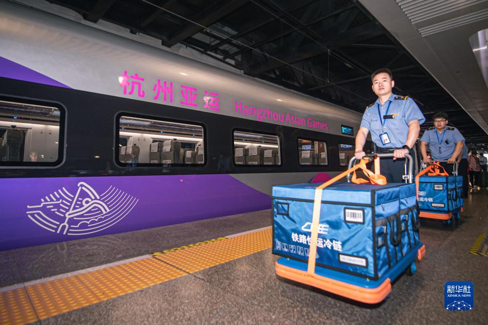 9月16日,中鐵快運(yùn)工作人員準(zhǔn)備將冷鏈運(yùn)輸?shù)暮贾輥嗊\(yùn)會(huì)興奮劑檢查樣本運(yùn)上復(fù)興號(hào)亞運(yùn)智能動(dòng)車組列車。
