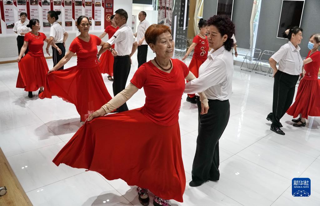 北京市朝陽區八里莊街道朝陽無限社區的居民在社區新時代文明實踐所排練舞蹈(9月14日攝)。