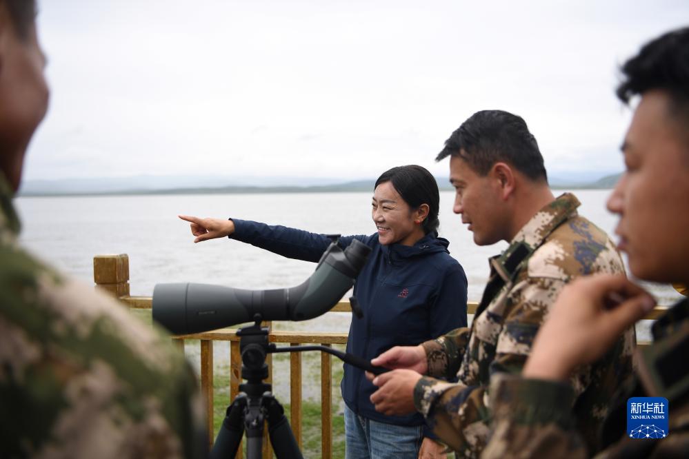 甘肅尕海則岔國家級自然保護區管護中心尕海保護站站長香毛吉(右三)和同事在保護區內巡護(7月7日攝)。