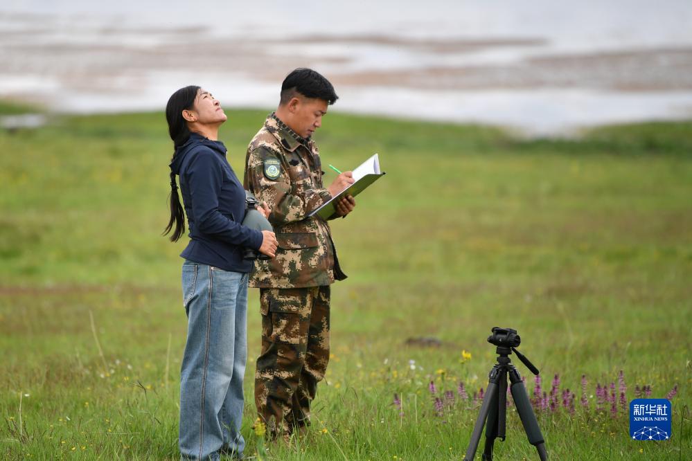 甘肅尕海則岔國家級自然保護區(qū)管護中心尕海保護站站長香毛吉(左)和同事在巡護過程中做記錄(7月7日攝)。