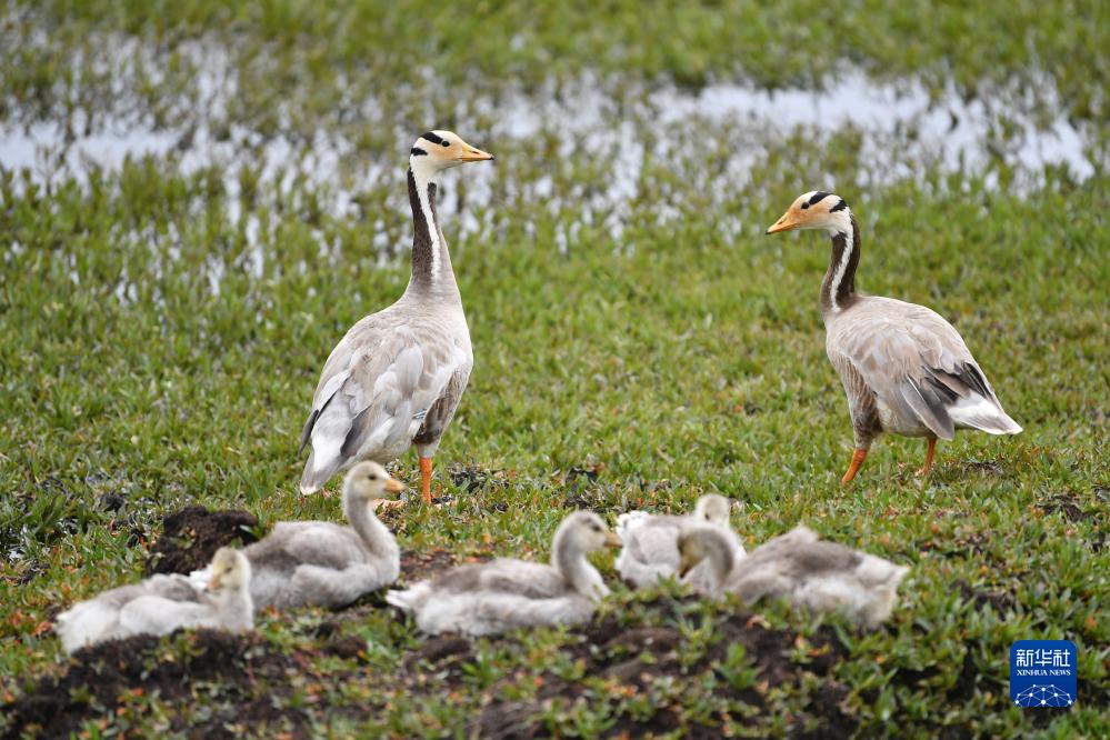 這是在甘肅尕海則岔國家級自然保護區的尕海濕地上拍攝的斑頭雁(7月7日攝)。