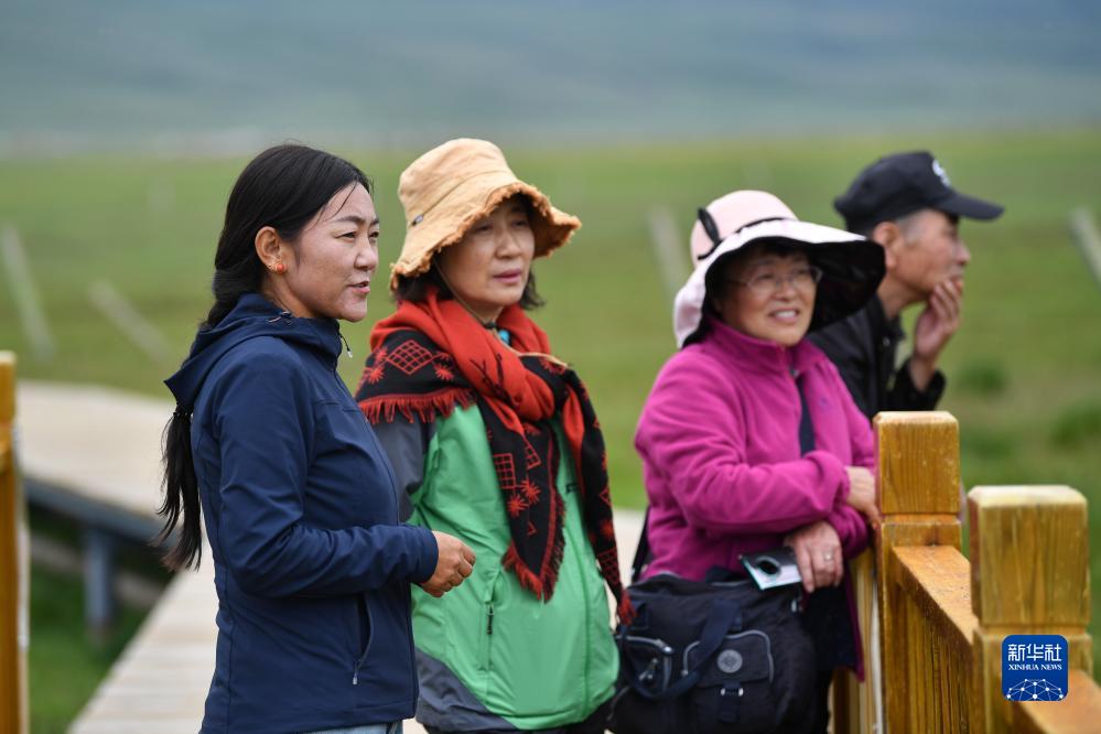 甘肅尕海則岔國家級自然保護區管護中心尕海保護站站長香毛吉(左一)向游客介紹保護區的野生動植物情況(7月7日攝)。
