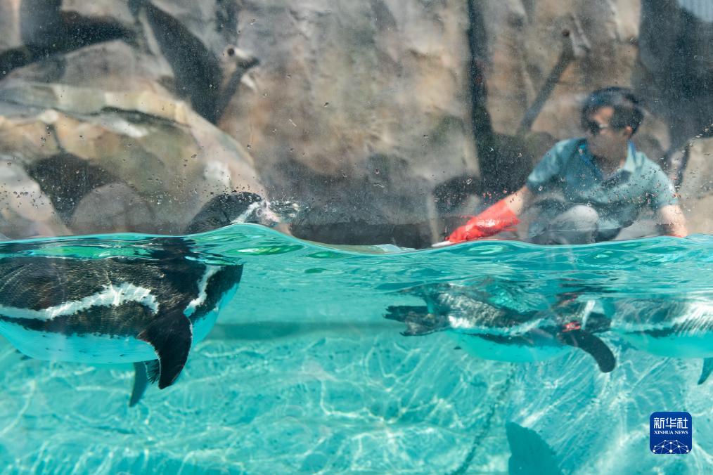 9月16日,武漢動物園的飼養員在給企鵝喂食。