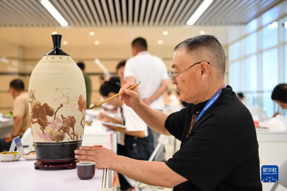 9月16日,在第二十四屆唐山中國(guó)陶瓷博覽會(huì)現(xiàn)場(chǎng),參加陶瓷藝術(shù)技藝大賽的選手在比賽中。