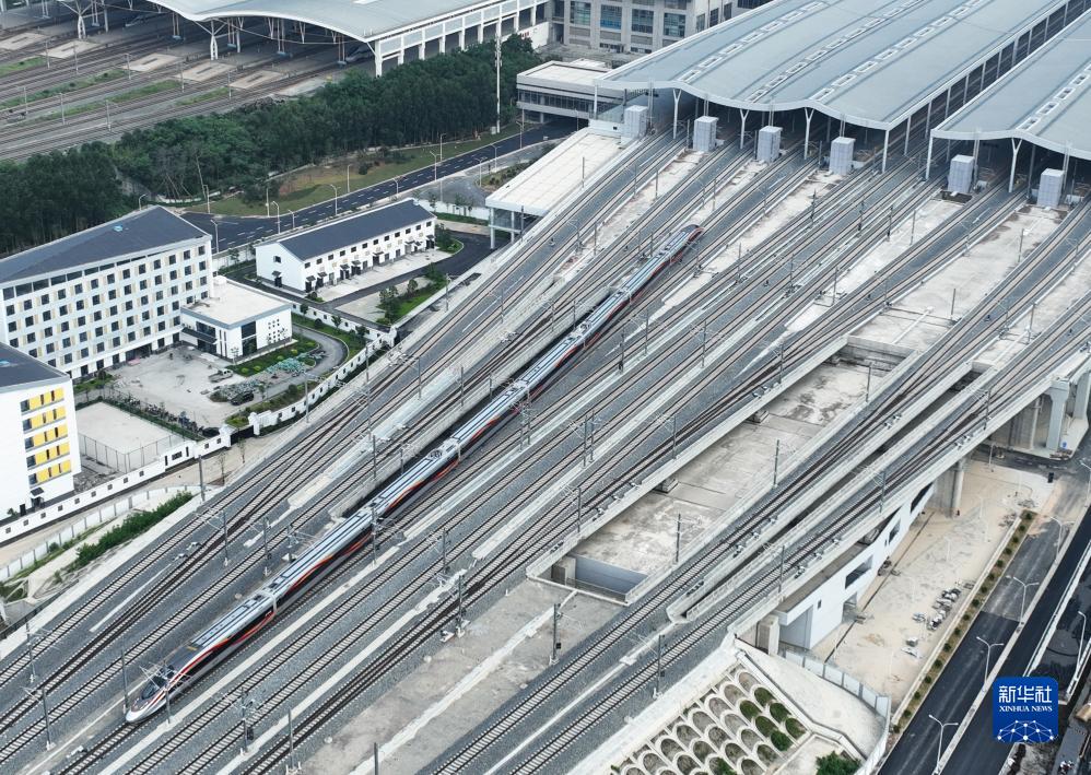 9月16日,復(fù)興號(hào)智能配置動(dòng)車組從福廈高鐵福州南站房開出(無人機(jī)照片)。