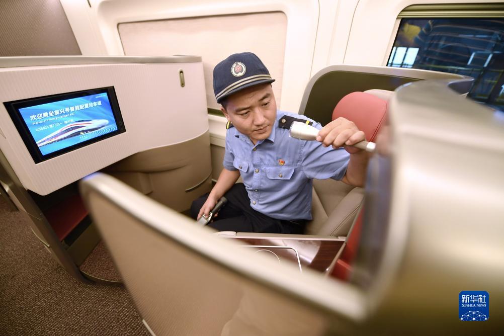 9月13日,高春成在復(fù)興號(hào)智能配置動(dòng)車組商務(wù)艙內(nèi)檢查設(shè)備。