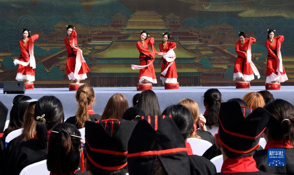 9月16日,中外大學生在交流活動上觀看漢代舞蹈表演。