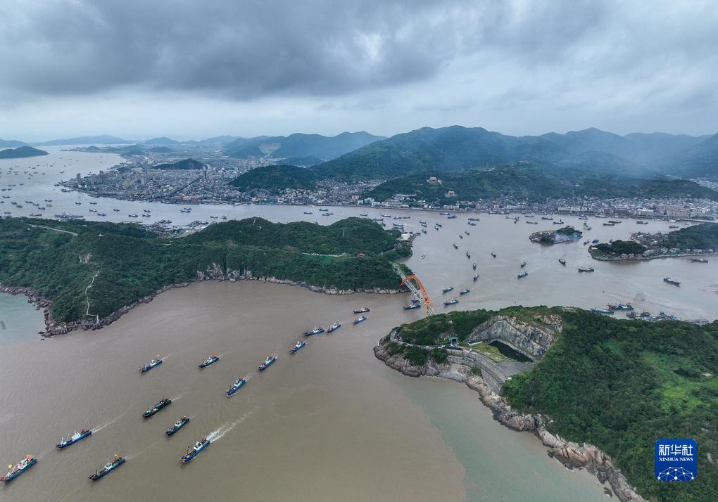 9月16日,漁船從浙江省寧波市象山縣石浦港出海(無人機照片)。