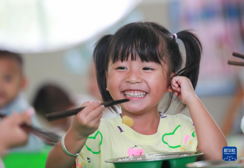 9月15日,貴州省從江縣剛邊壯族鄉中心幼兒園的小朋友在享用免費營養午餐。