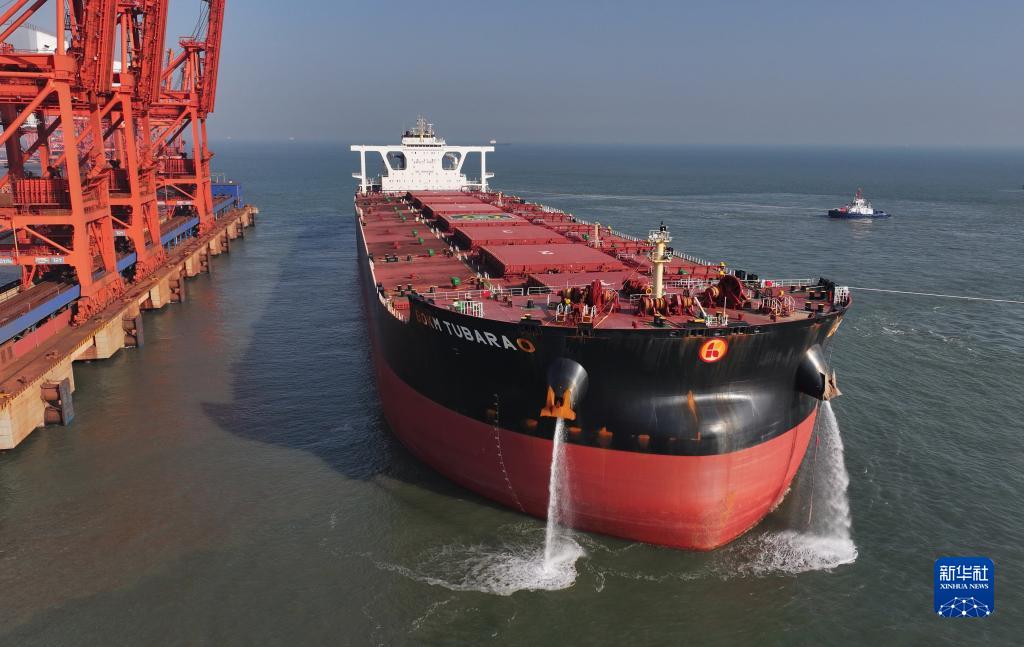 9月16日,一艘輪船駛離唐山港曹妃甸港區礦石碼頭(無人機照片)。