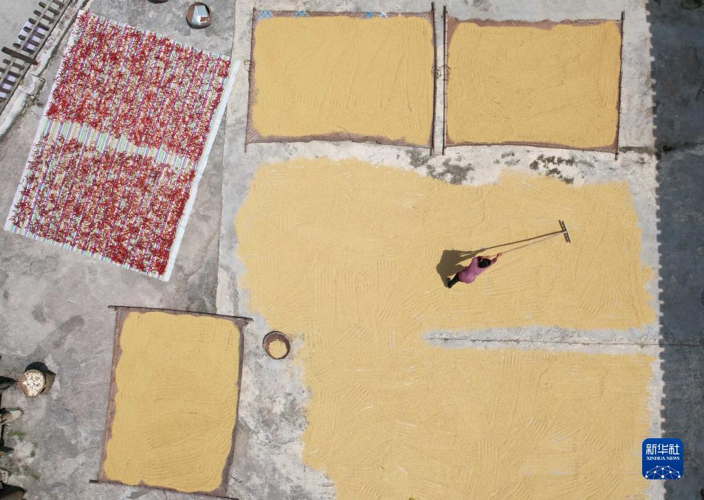 金秋時節,各地農民抓住晴好天氣晾曬收獲的高粱、水稻、玉米等糧食作物,呈現多彩的豐收圖景。
